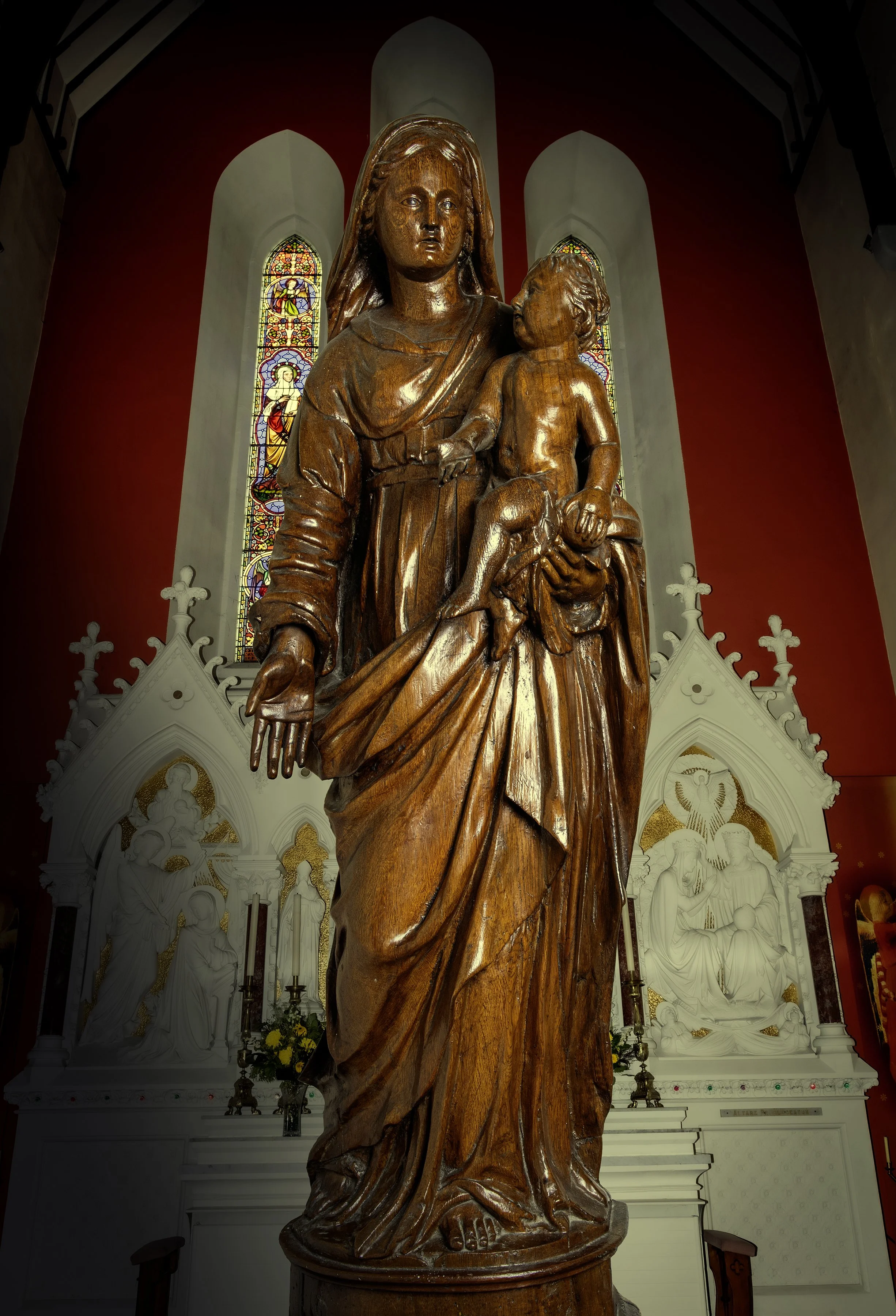 “All the post-Reformation chapels down to 1867 stood within Thomastown’s ‘chapel graveyards.’ The old chapel of the Penal Times was taken down about 1770 after the Parish Chapel, in use until 1867, was built around it. The present church was built in 1867. A prominent place in all these Churches was held by a beautiful carved oak statue of the Virgin and Child, said to have been brought from Spain by Patrick Lincoln, a wine merchant of Thomastown, who died in 1666. Mr. Lincoln’s widow, Mary Lincoln (née Dobbin), who died in 1709, presented the statue with crowns of silver in 1705. One account says the crowns were later stolen; another says they were exchanged by the Parish Priests for church plate. The statue has always held a prominent place in the Churches since 1705.”